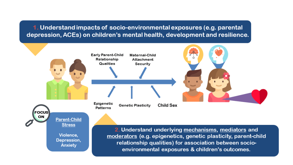To understand underlying mechanisms, mediators, and moderators (e.g. epigenetic patterns, genetic plasticity, cortisol, child sex, parent-child relationship qualities including sensitivity and responsiveness, maternal-child attachment security) of the association between socio-environmental exposures and children’s outcomes in objective 1.